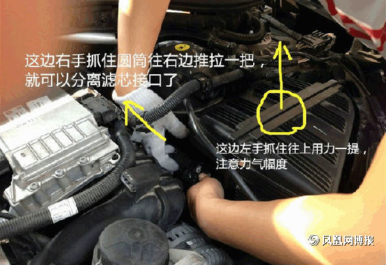 这个时候右手抓住圆筒向右边用力推,这时候筒口就跟滤芯接口分开了,左手抓住空气滤芯上面往上提就可以拿出来了。简单吧!